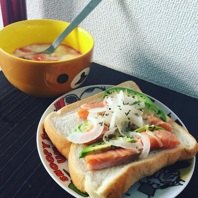 #朝ごはん #ぼっち飯 アボカドサーモントーストと自家製イチゴジャム入りヨーグルトwww テラ女子力高いwww
