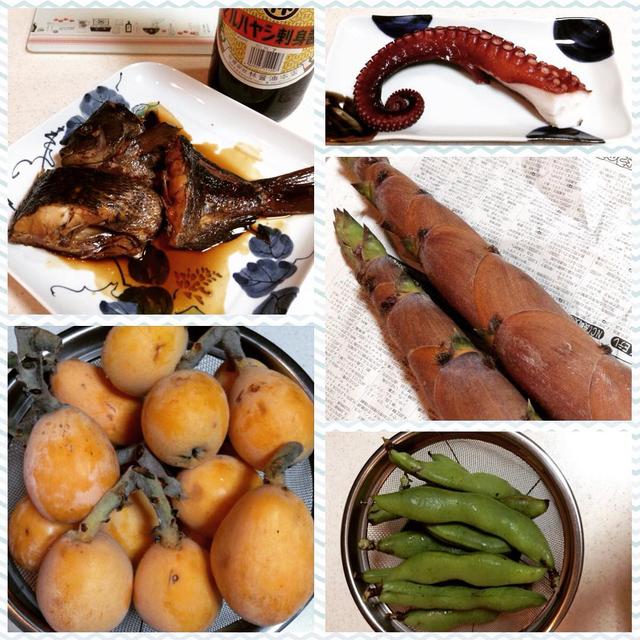 いただき物生活✨✨*週末は何だか色んな方から貢いで貰っちゃいました❤️(笑)*お義兄さまからの釣り物クロ(メジナ)はお煮付けへ*「傷入って出荷出来ないから食べて〜」と農家の親戚からビワ*「貰ったけど歯が悪くて食べれないから」と主人の母と半分こしたタコの足*どこからか届いた筍(ハチク)*主人の母から家庭菜園のそら豆*写真はありませんが、親戚のおじ様よりイトヨリ**皆さまに支えられて今週も頑張りまーす感謝❤️感謝❤️**#いただきもの #foodpics #foodgram #instafood #japanesefood#クロのお煮付けは#長崎ならではの#甘口刺身醤油で味付け#我が家は#マルハヤシ醤油#お取り寄せ ❣️#県外の人は#濃い刺身醤油みて#ビックリするらしい(≧∇≦)