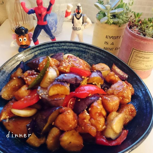 本日のメイン *鶏むね肉となすピーのさっぱり炒め1素揚げしたナス、鶏のから揚げ、ピーマン。2フライパンに薄く油をひき潰したにんにく、ショウガの風味を出す。3そこへ1を入れ醤油、酢各大さじ2、砂糖大さじ1を絡めて出来上がり!!美味しいよ♥#夜ご飯#夕食#dinner#おかず#おうちごはん#food