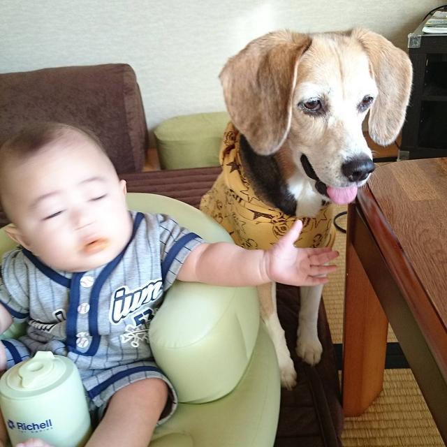 残念顔の一汰とウマウマしか見てないチップ先輩(* ́ー`*) 昨日寝たん1時半で起こされたの4時半起きるまで大泣き坊主 家族で起きるしかないよね