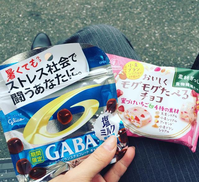 会社戻る前に一服&夕方のおやつゲット ジップロック助かりますヽ(•̀ω•́ )ゝ✧ それよりネーミング笑 #チョコ #おやつ #gaba #ギャバ #塩ミルク #期間限定 #gulico #morinaga #小麦ブラン #シリアル #苺チョコ