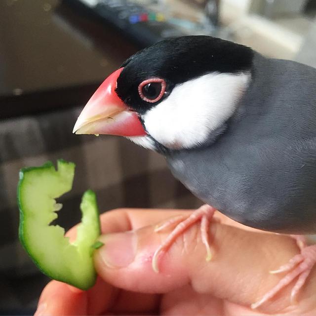 きゅうり大好き! * おみかんより苺より夢中になって食べます。 * * #buncho#文鳥#桜文鳥#もなか#きゅうり#ヘルシー志向
