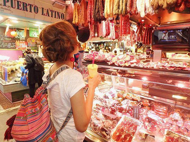 変わったサラミさんのお店✨! . 生ハムが安くて美味しくて最高 . #生ハム#サラミ#市場#撮影 #楽しい#Barcelona #スペイン#ヨーロッパ#サクランボのピアス #リュック