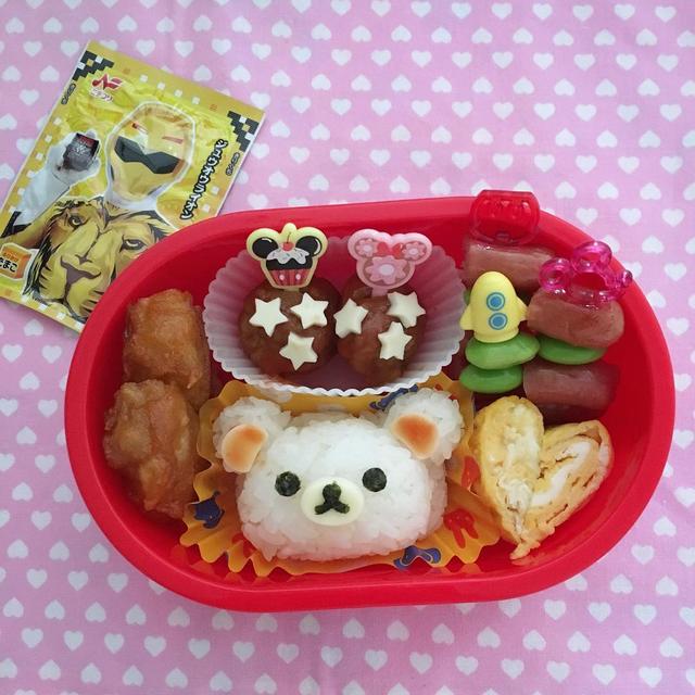 □ □ □#今日のお弁当#obento#bento#lunchbox#キャラ弁#デコ弁#幼稚園弁当#年中弁当#毎度のお寝坊さん で#コリラックマ弁当#くくたん弁当#ハム買い忘れ(T ^ T)#耳も雑ー(¬_¬)#ジュウオウジャーふりかけ つけとくね!で#満足そうな娘っこ。#いってらっしゃい