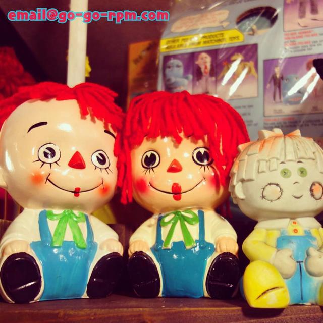 ラガディ・アン&アンディ赤い毛糸の髪の毛の絵本のキャラクター1910年代に絵本が発売され現在もアメリカでとても愛されているアンとアンディです左側 : 1970's ペーパーマッシュバンク(紙粘土のような材質)2個セット7980yen右側 : 1970's スクイーズ(ソフビ製)3980yen