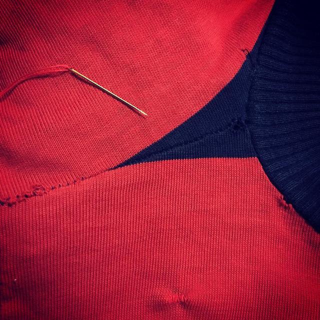 #縫い縫い倶楽部夏に大活躍ボーダーT。ピンホール野放しにしたら大変なことに...夜な夜な、修繕活動に励みます#修繕活動#修活#オリオン座#如きピンホール達#セルフリペア#穴は塞げど目立つ仕上がり#まぁいっか#50s#ボーダーT#vintageclothing#vintagetshirt#repairing