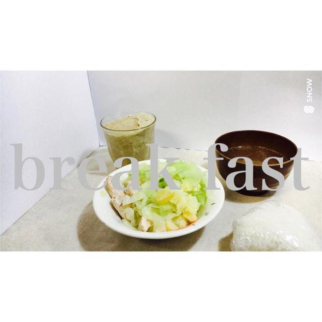 久しぶりの投稿・スムージー・サラダ(キャベツ ジャガイモ 鶏肉)・鶏肉の茹で汁のスープ・なぜが巨大化したサンマオニギリ#breakfast#smoothie#morning#tennis#soup#love#delicious#fruit#onigiri#cooking