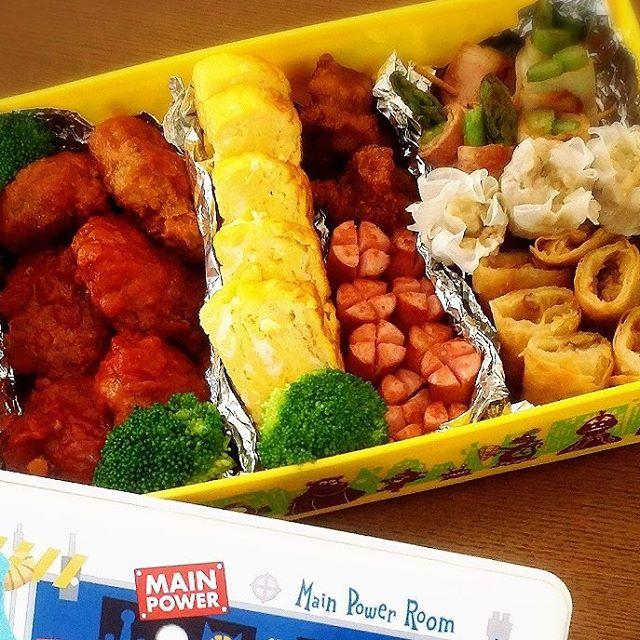 運動会のお弁当~♡(おかず)*とまと煮込みハンバーグ*たまごやき*からあげ*ウインナー*アスパラベーコン巻き*たけのこシュウマイ*春巻き晴れてよかった~ ( ́ฅ•ω•ฅ`)♡ #運動会#運動会弁当#がんばれ#運動会での一番の楽しみはお友達とのお菓子交換らしいww