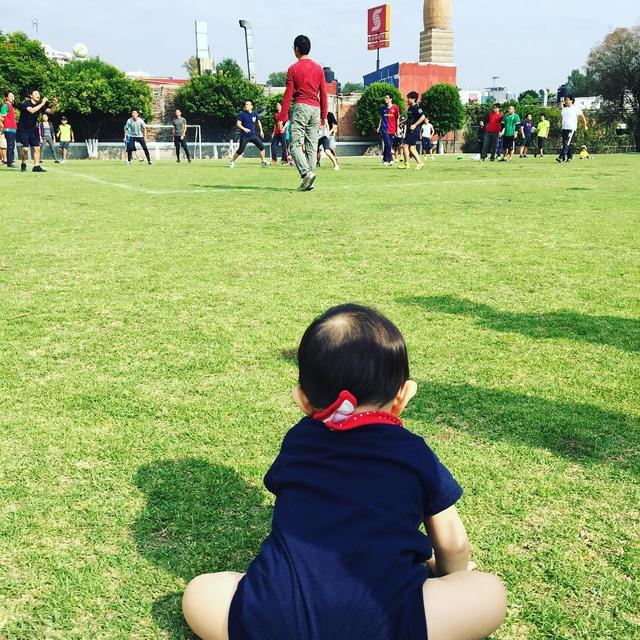 2016.5.28 とーしゃん、頑張って〜!と声援を送るこーちゃん。日本人学校の運動場でドッジボール大会。初めての芝生は、チクチクするらしくご不満でした。