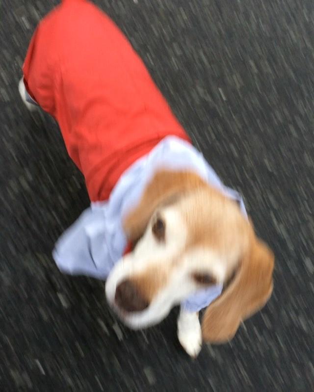 今朝は〜雨... ウルトラカッパで出動デス! さっきオヤツ貰ったから ペロペロしとります #dog#犬#beagle#ビーグル#レインコートでお散歩#尻尾上がってます!!️#下がったらどーなる?