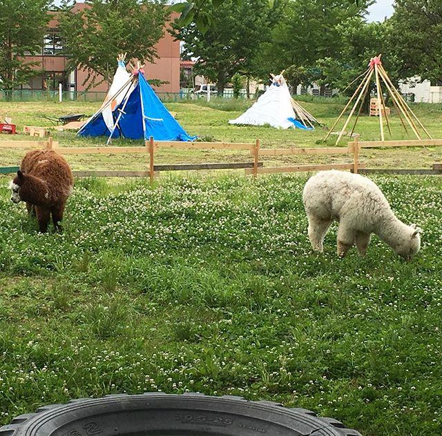 ニューメキシコ州出張から戻って、最初の夫婦ウォーキング。•久し振りにアルパカを観察。なごむわぁ〜、脱力できるわぁ〜•人なつっこそうな子が、フェンス越しに「どっちも男の子だよ。白いのは『おから』って名前なの。変でしょ!?︎」と教えてくれた。•茶色の名前を尋ねる前に、2匹の方へ走って行ってしまった。•背景には、ニューメキシコ州でもあまり見掛けないティーピーが立ち並び•日本のありふれた地方都市にある小学校とは思えない、このゆる〜い雰囲気、好きだわー••オルテガベスト&ブランケットとインディアンジュエリーの専門店、当店ベアトラックの公式アカウント @bear_track_kobayashi も是非ご覧下さいね❗