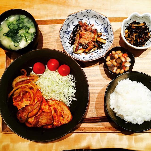 今日の夜ごはん 生姜焼き ナスのお浸し ひじき煮 お豆さん 豆腐とネギの味噌汁