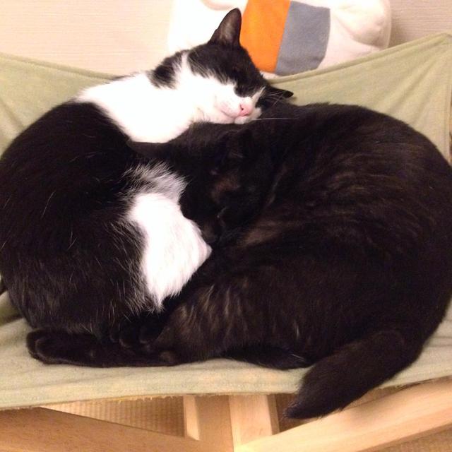 今夜は珍しい組み合わせですが おやすみにゃぁ #ネコ #ねこ #猫 #cat #黒ちゃん #黒ねこ #黒ネコ #黒猫 #ナグちゃん #黒白 #はちわれ #ハチワレ #猫の寝姿