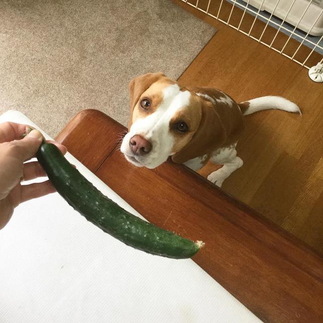 今年の初収穫! ディアナにも分けてあげるからね〜^ ^ #犬#ビーグル#dog#beaglestagram #キュウリ