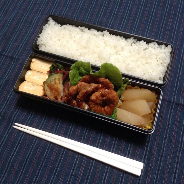 ・2016/06/01お弁当日記。♪たまご焼き♪スイスチャードのスパイス炒め、 ズッキーニのチーズ焼き♪トンデリング♪大根の炊いたん・・たまねぎの輪切りに、豚バラ肉を巻きつけて焼いたのを「トンデリング」って言うんですって。・・#お弁当#お昼ごはん#お弁当日記 #サラメシ#obento#bento#lunchbox#bentobox #lunch#だんなさん弁当#家庭菜園#スイスチャード#ズッキーニ#たまねぎ#大根#レタス#トンデリング#お弁当包み#handmade#もぐー 見て作りました