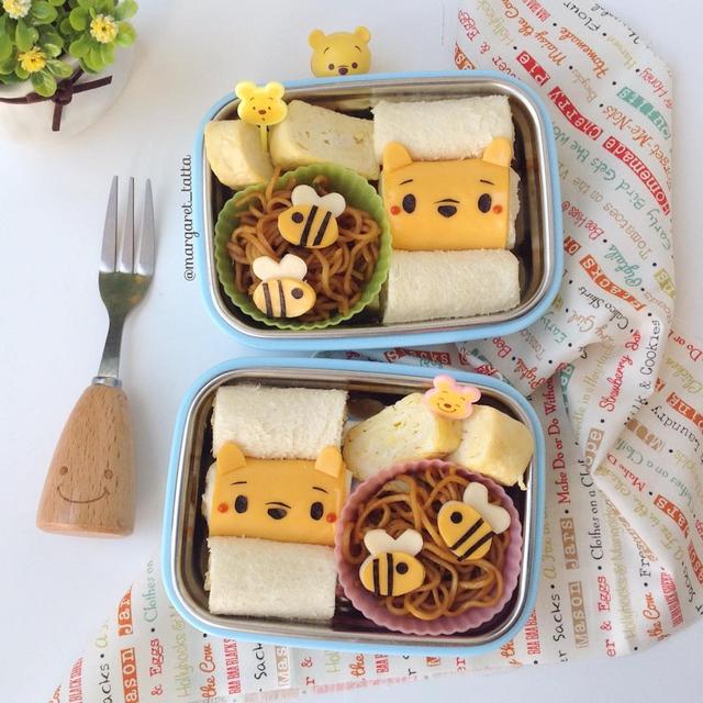 Winnie the pooh tsumtsum sandwich rolls for kids today, along with fried noodles and tamago, hello to all poohlovers out there #tattadiary #igms_id #winniethepooh #tsumtsum