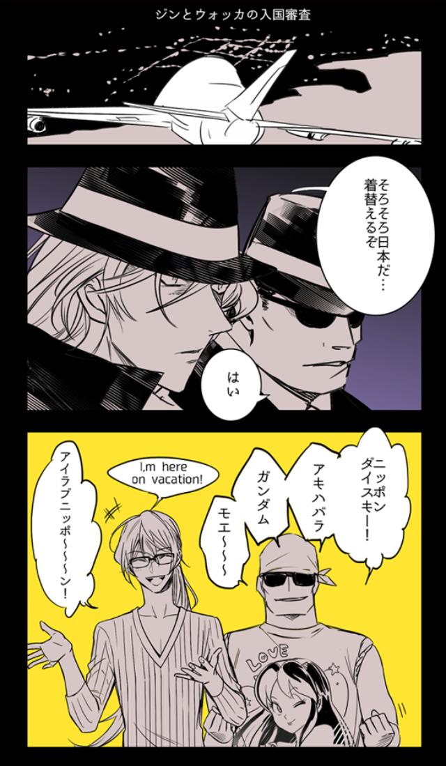 友達がジンとウォッカの入国審査について真剣に心配してたの面白すぎて描いたのも置いておきます。ジンニキはイケイケバカンス... https://t.co/7LdQGcbMt7 | https://t.co/jgJmjqBNz3 https://t.co/SjYBbNnEf2